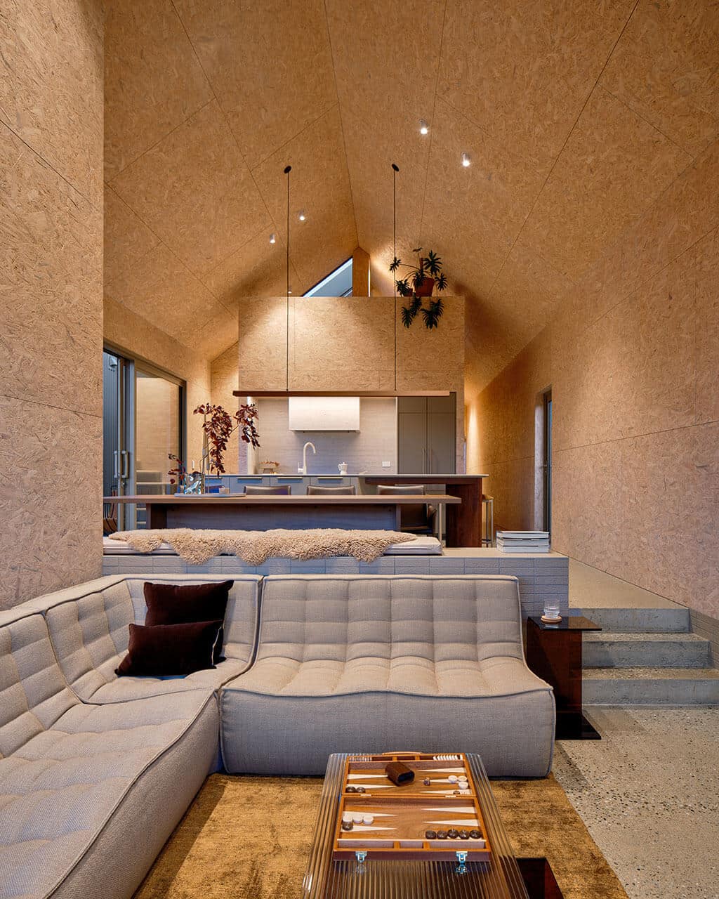 Running through the spaces, from the open-plan living room to the bedrooms and dressing room, the polished floor, made from a local Hyland aggregate, provides an underfoot presence that has just enough movement and tonal variation to add interest without distraction.