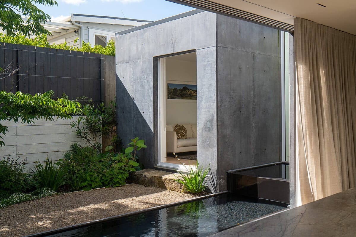 Against a light-filled addition sits a cuboid form of dark-coloured concrete: weighty, monolithic, and deliberate. Coloured with PeterFell black oxide, the volume has already begun to patinate, settling quietly into its garden courtyard. Fronds creep across its surface; shadows and watery reflections animate its solidity. The effect is painterly — a study in light and permanence, where coloured concrete offers an intriguing depth.