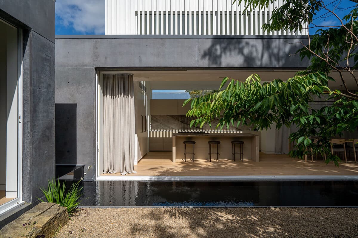 Across the water, the kitchen and dining area is framed with the same dark-coloured concrete but here it gives way to an external timber screen that wraps high windows — a nod to the white picket fences of the area, and a decision by Jose that ensures this house lives up to its name: Light Catcher.