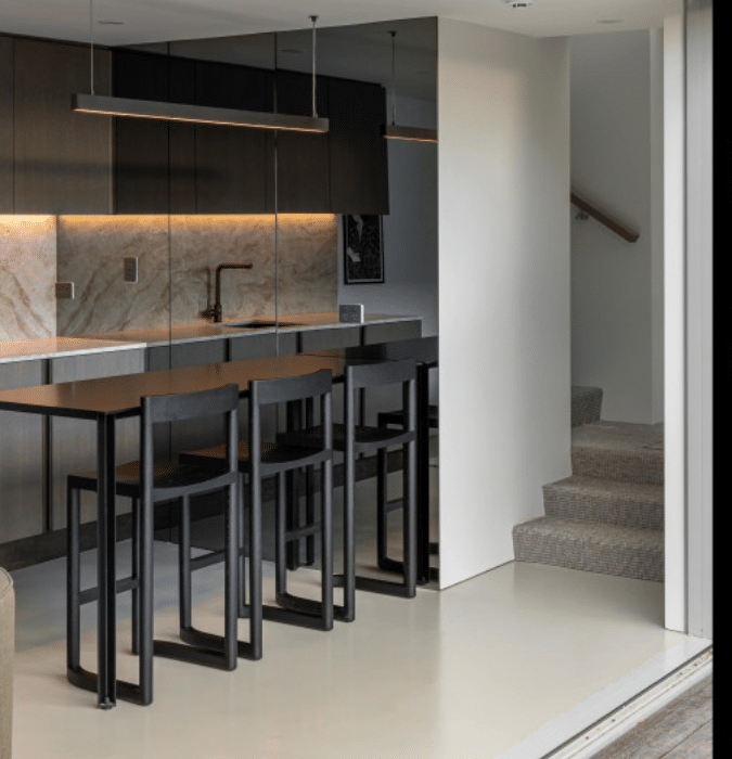 “It was selecting the colour that was most important. It had to be a cool tone, and one against which we could place the Taj Mahal stone bench – a material echoed in the kitchen of the main dwelling. “Peter Fell has such a varied, beautiful selection of colours. We knew immediately that we wanted a colour from the Premium Charcoal range. We found a really lovely oystery, creamy colour [PeterFell 651]. By using coloured concrete, we were able to turn an intimate and compact space into something that feels sophisticated and refined.