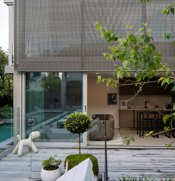There’s a certain joy in this pool house; the oyster white of the floor, and the distinctive tonality of the stone draw you into a space designed as a place from which to look out – onto a decadent poolscape of green foliage and turquoise water.