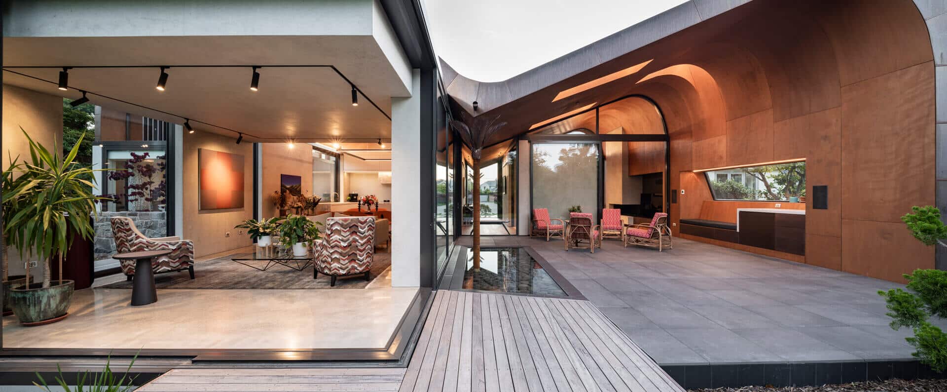 Put in very simplistic terms, the house is made up of three strategically placed concrete pavilions tied together by a highly sculptural copper roof.
