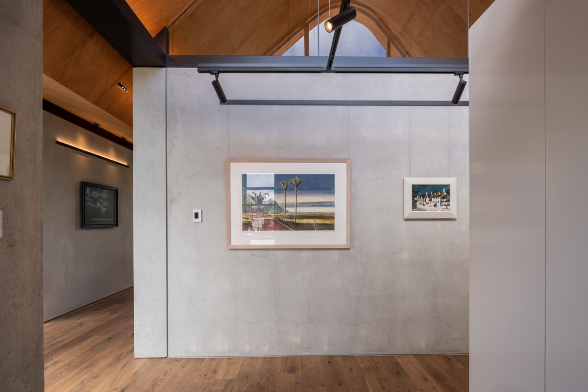 The light charcoal tones on the interior concrete walls act as a neutral, tactile backdrop for the owner’s impressive collection of art.