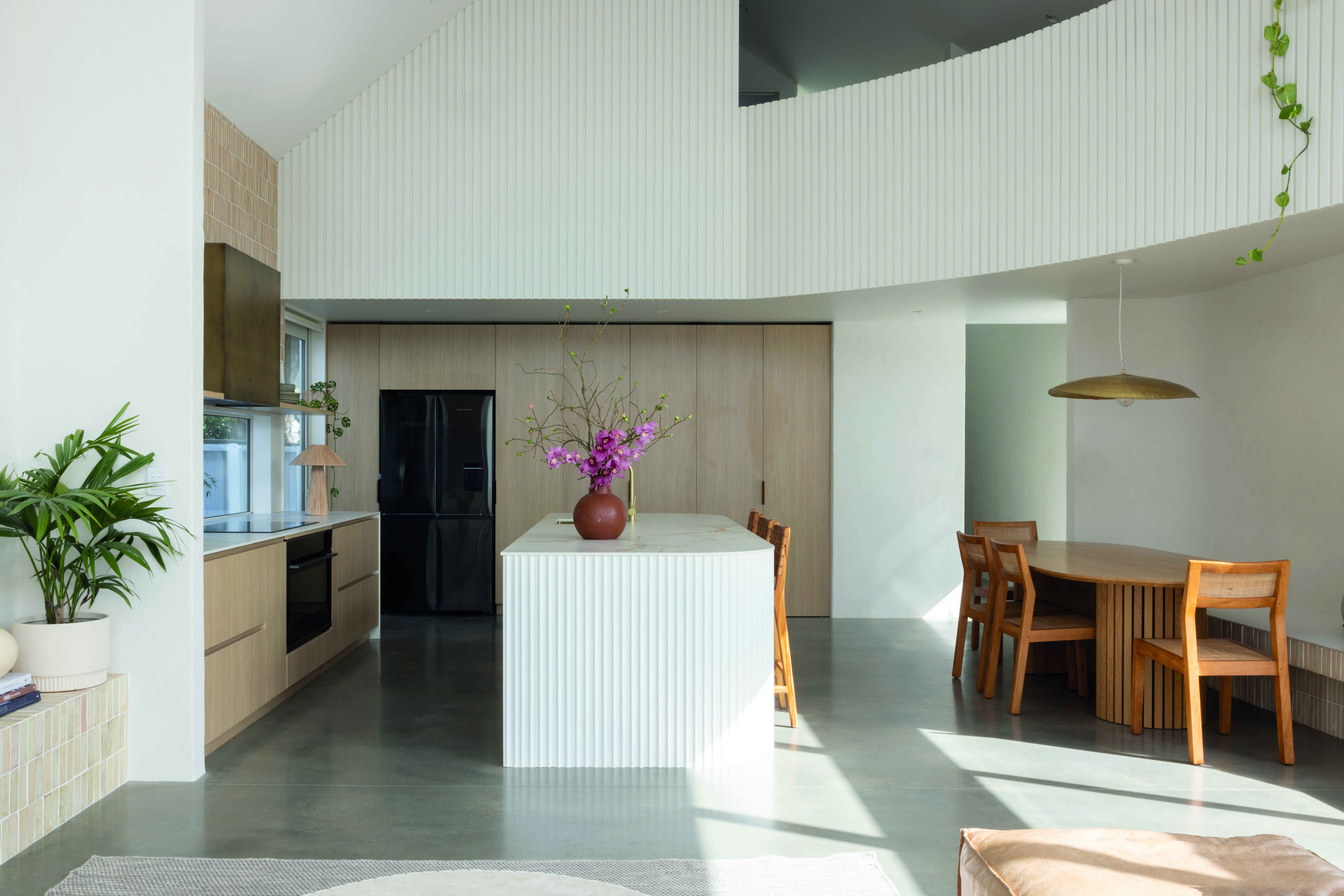 Despite the pooch, it’s texture that’s top dog around here, with the concrete grounding the overall effect. The couple choose the hue PFL137 from PeterFell’s Neutral range, with a minimum grind and polish for a matte finish to complement other tactile elements in their material palette, such as their plastered walls.