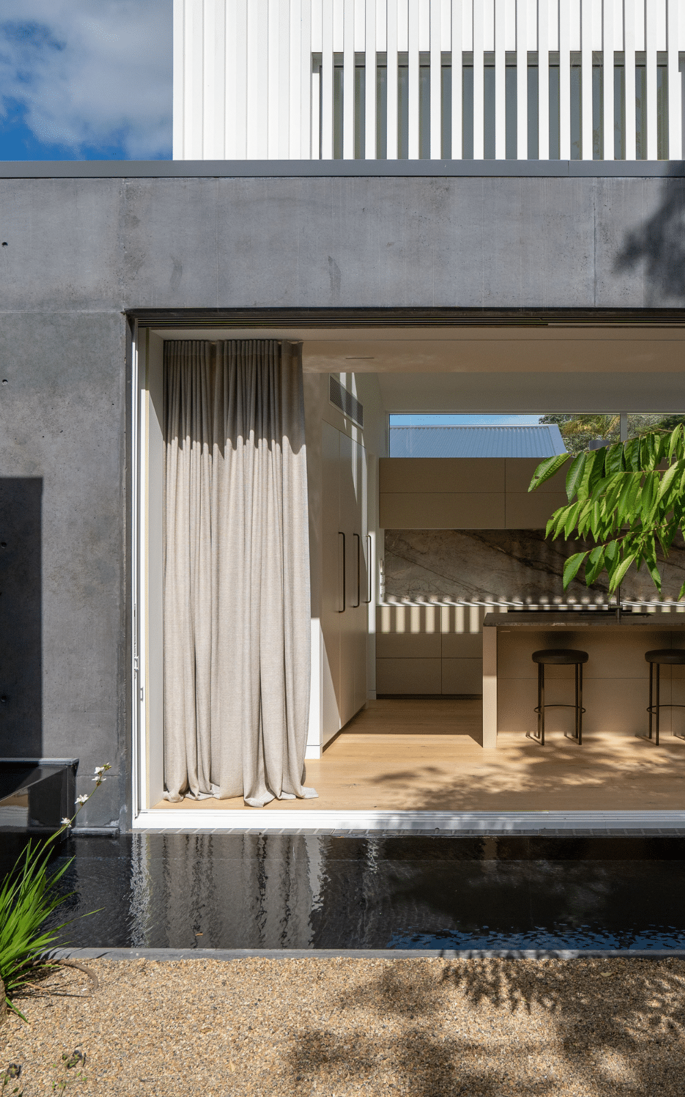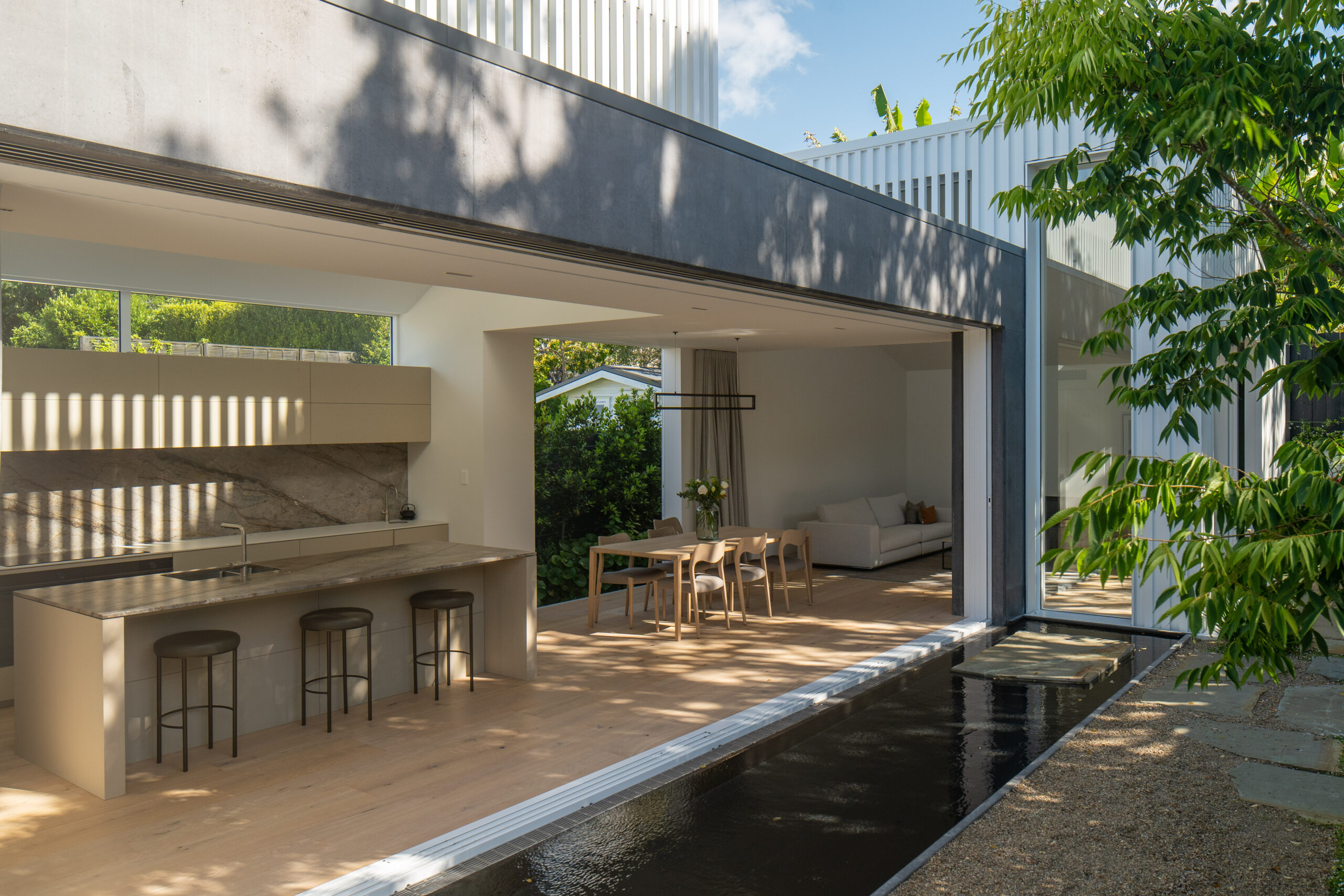 The extension is separated into two parts, creating spaces that interact and connect with one another across the water. Stepped down from the original dwelling, the larger of the two extends out to the rear boundary, where a second west-facing living room is located. Adjacent is the kitchen and dining area, which becomes the central hub of the house and opens to the reflection pond and courtyard with large cavity sliders.