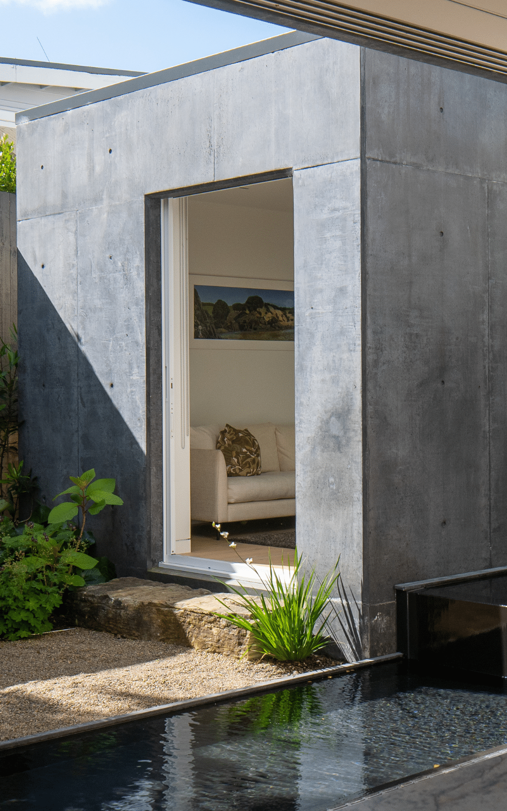 The second part, also west facing, is framed in view from this area; a counterweight to the light dancing across the water, its rectilinear concrete form is darkened with PeterFell black oxide.