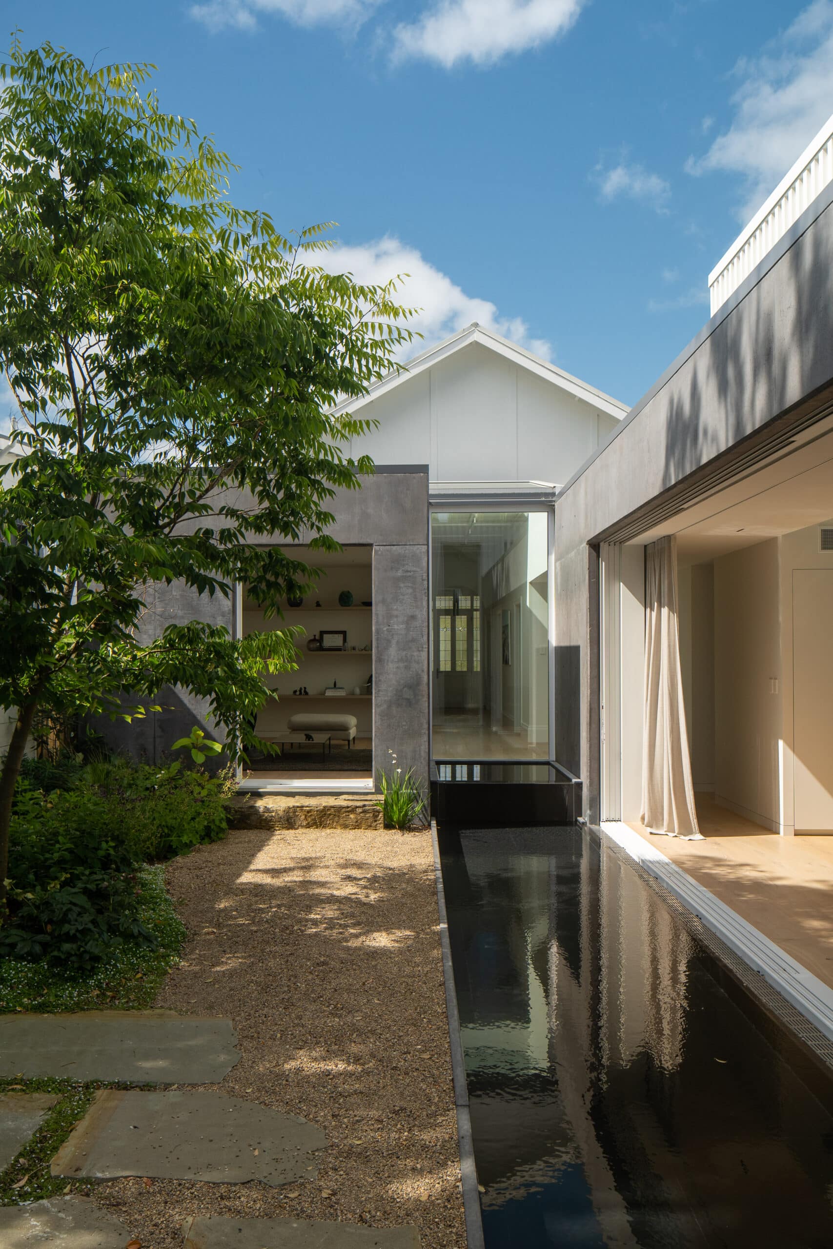 “The client had an interest in creating a calm haven to enjoy. She’s a busy person and lives in a bustling inner-city suburb, so [a haven] was an important part of the brief. The rear courtyard offers that calmness with the central element of water, which bounces light around and sets a general mood.”