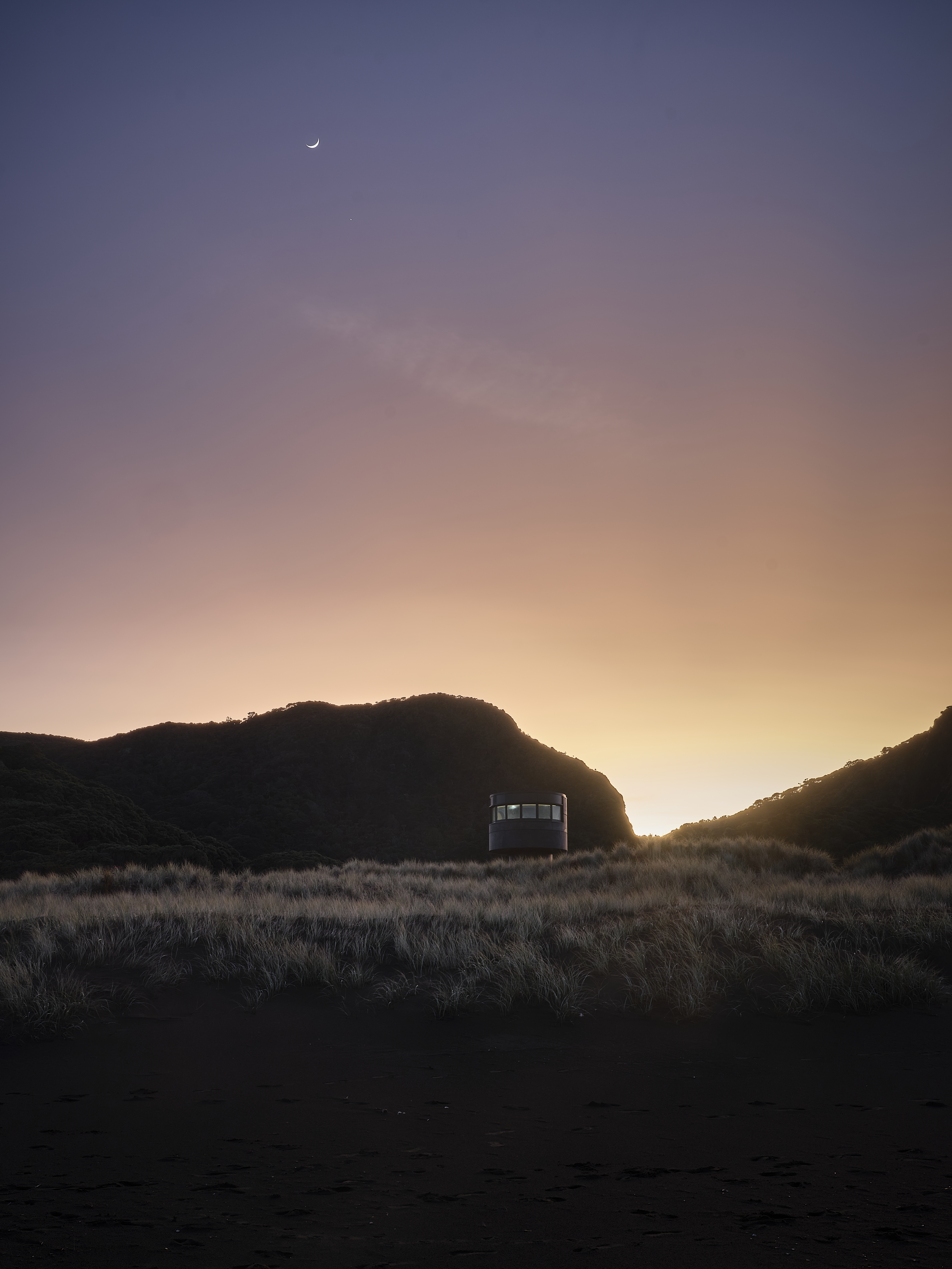 Perched amongst the black-sanded dunes, Te Pae Surf Life-saving Tower has undoubtedly found its place, just as PeterFell’s 699 SuperBlack has found its match. With Piha’s dark rocky headlands and native bush forming the backdrop, the tower’s dark, cylindrical concrete appears to be of the same language. It speaks to the land that it belongs to, from the distant hilltops back down to the beach’s fine dark sands.